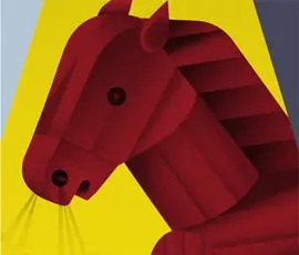 Abstract red horse head, stylized art deco design, vibrant yellow background. Geometric shapes create a bold, graphic representation of equine form.
