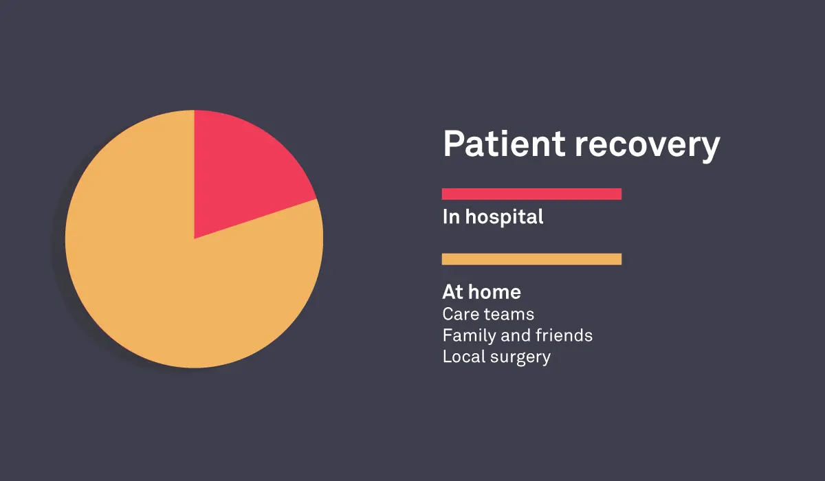 Direct medical care (in hospital) generally covers just the first 20% of patient recovery time, the remaining 80% is provided by the health and social care that surrounds it. It’s therefore important that we provide patients and care teams with the information and tools they need to monitor and proactively support patient recovery once they’ve left hospital.